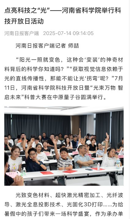 7月11日,由我所主办的河南省科学院科技开放日暨“光束万物智启未来”科普大赛活动中,多支科研团队积极备战,精心打磨参赛内容,光致变色材料、超快激光精密加工、激光全息投影、光固化3D打印等科普装置逐一亮相,通过“以赛促普”的方式,让观众在近距离体验中直观感受科学的独特魅力。