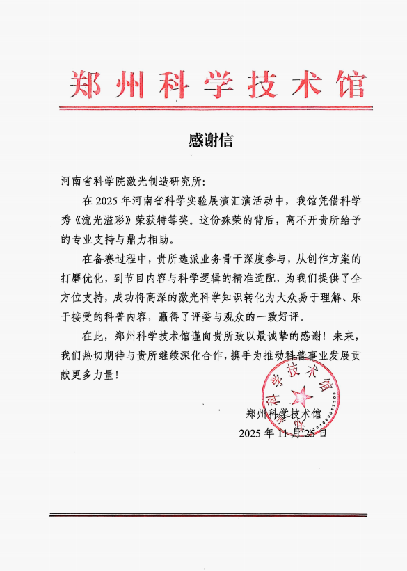 10月18日,我所与郑州科技馆携手打造的科学实验《流光溢彩》,在2025年河南省科学实验展演汇演中以第一名的优异成绩斩获特等奖。实验以跨时空角色设定、震撼视频开场和环环相扣的趣味环节,生动展示激光高单色性、高方向性、高相干性和高能量特性四大核心特性,实验环节精心设计,兼具科学严谨性与视觉美感,实现“寓教于乐”的科普目标。