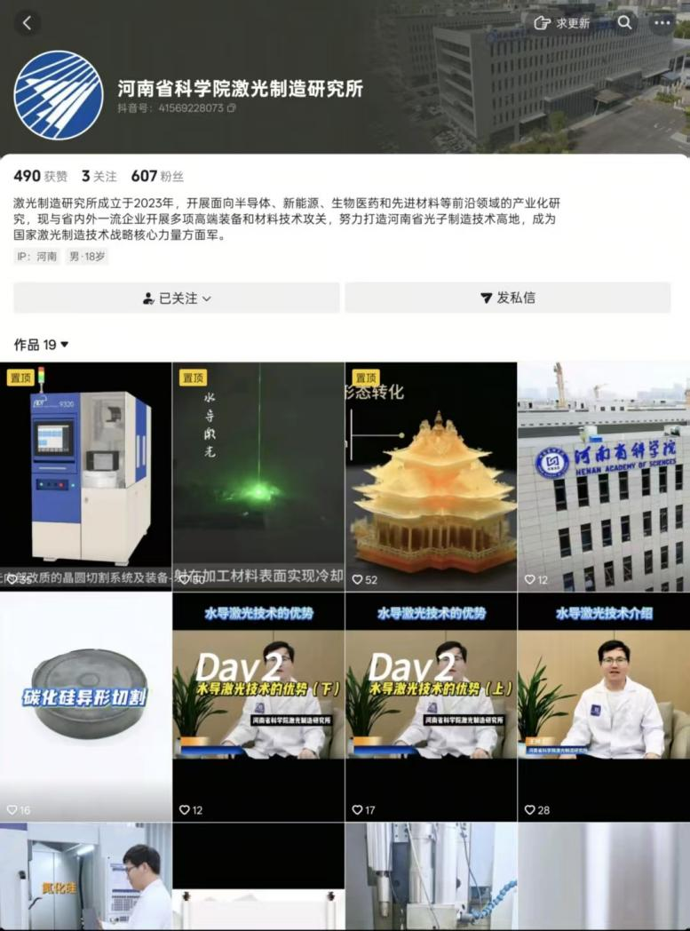 我所构建了以公众号、抖音号、视频号为核心的新媒体矩阵,多渠道协同推进科普传播。公众号聚焦科研动态与深度解读,筑牢专业根基;抖音、视频号推出水导激光、3D打印材料等系列视频,以实验演示、博士讲解等形式,将激光技术转化为通俗易懂的短视频内容,推动激光知识从实验室走向大众。
