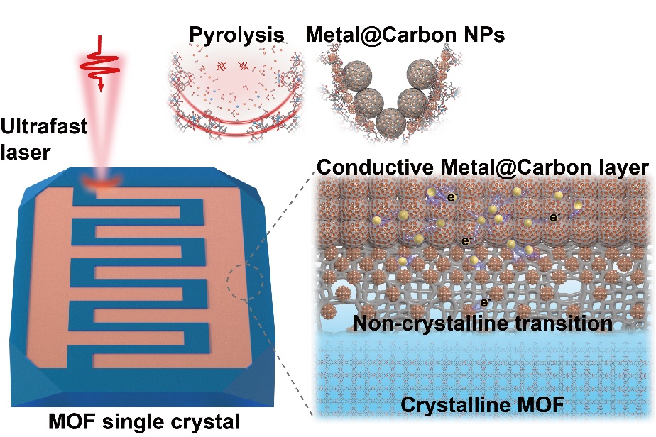 聚焦激光作为精准的高能热源,对MOF诱导衍生出多功能纳米材料方面具有显著优势。这种独特的能力为MOF单晶的新型微/纳米衍生加工提供了可能。为此,本研究首次提出利用超快脉冲激光在MOF单晶尺度上通过超快激光原位写入的方式构建导电界面。在有机配体的热解过程中,配位金属原子被还原为碳包裹的均匀分布的金属纳米颗粒,通过这种方式,可在单个MOF晶体上即时写入碳基金属导电图形化界面而无需额外工艺步骤,同时了保留未加工区域的晶体结构,实现导电界面和晶态多孔结构的协同响应。