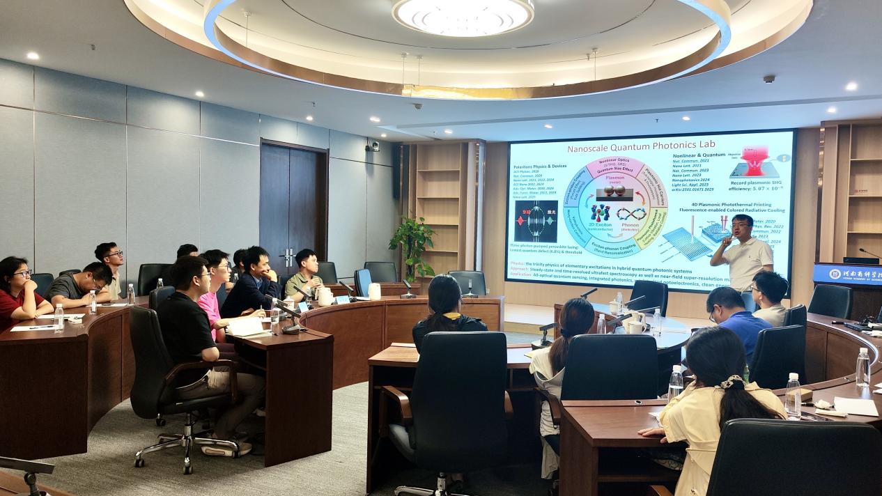 7月15日上午,王建方教授、雷党愿教授受邀在河南省科学院206国际会议室作题为《等离激元纳米腔与手性等离激元纳米粒子》、《等离激元纳腔中的非线性光学和量子隧穿现象》的学术报告,系统介绍了团队在对称破缺等离激元纳腔中长期被忽视的四个非线性光学和量子隧穿现象、聚焦等离激元纳米腔与手性等离激元纳米粒子合成方面的前沿研究阶段成果。