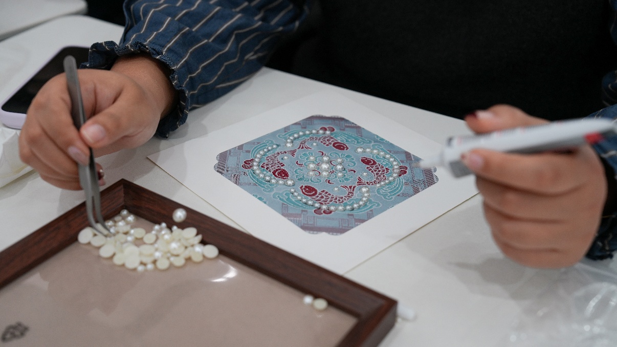 活动现场,女会员们兴致盎然、动手创作,细心粘贴珍珠、精心搭配色彩,在指尖勾勒出一幅幅精致美观的宋锦珍珠画。大家相互交流、切磋技巧,现场氛围轻松愉悦、暖意融融。在沉浸式非遗手工体验中,大家舒缓了工作压力、感受传统美学魅力,一件件独具匠心的作品相继完成,成为专属的节日纪念。